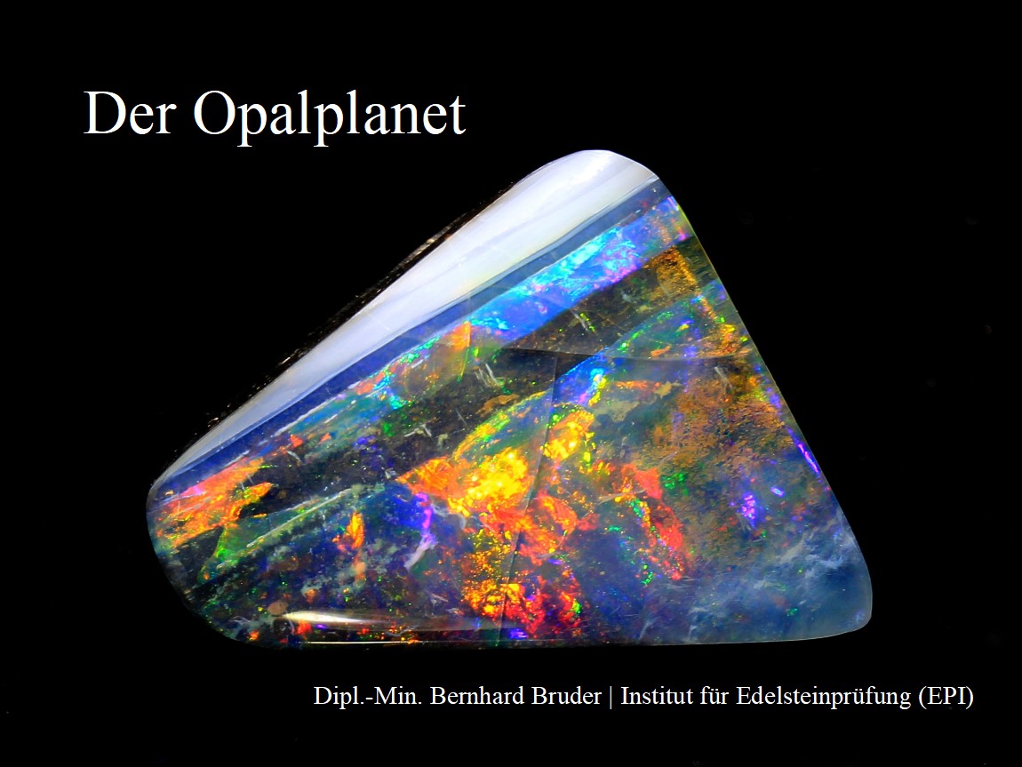 Beschreibung: Dipl.-Mineraloge Bernhard Bruder vom Institut für Edelsteinprüfung (EPI) beschreibt in diesem Vortrag die wichtigsten Lagerstätten von Edelopal in Australien, Äthiopien, Mexiko und Honduras. Mit ästhetisch ansprechenden Bildern charakterisiert er die dort gefundenen Opale und zeigt künstliche Veränderungen und Imitationen.